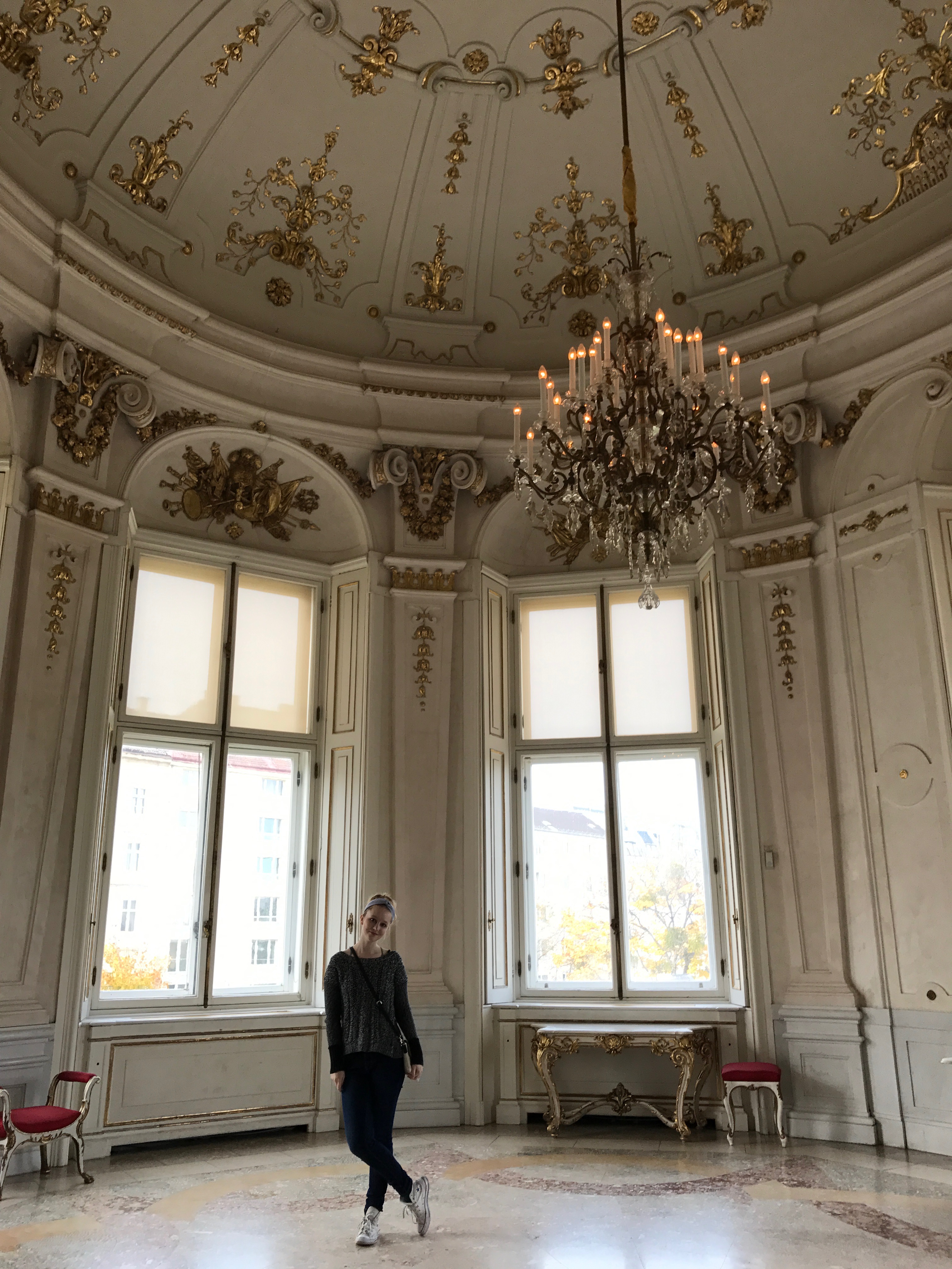 After spending a few hours in the Belvedere, we walked to the picturesque Kleines Cafe and sat outside on teal tables. When in Vienna you must get two things: apple strudel and sachertorte, which is a traditional and fudgy Viennese chocolate cake. So of course we ordered both at Kleines, along with Viennese-style cappuccinos. It was delicious. We sat in the cool fall weather and watched fashionable people walk by. I had no idea, but Vienna is supremely stylish. Sartorial splendor everywhere! I’d see couture-level outfits pass by, young women with bright tousled hair in dreadfully hip get-ups, men in designer coats and older couples with fine hats and cashmeres scarves. It’s enough to make a person want to go shopping…