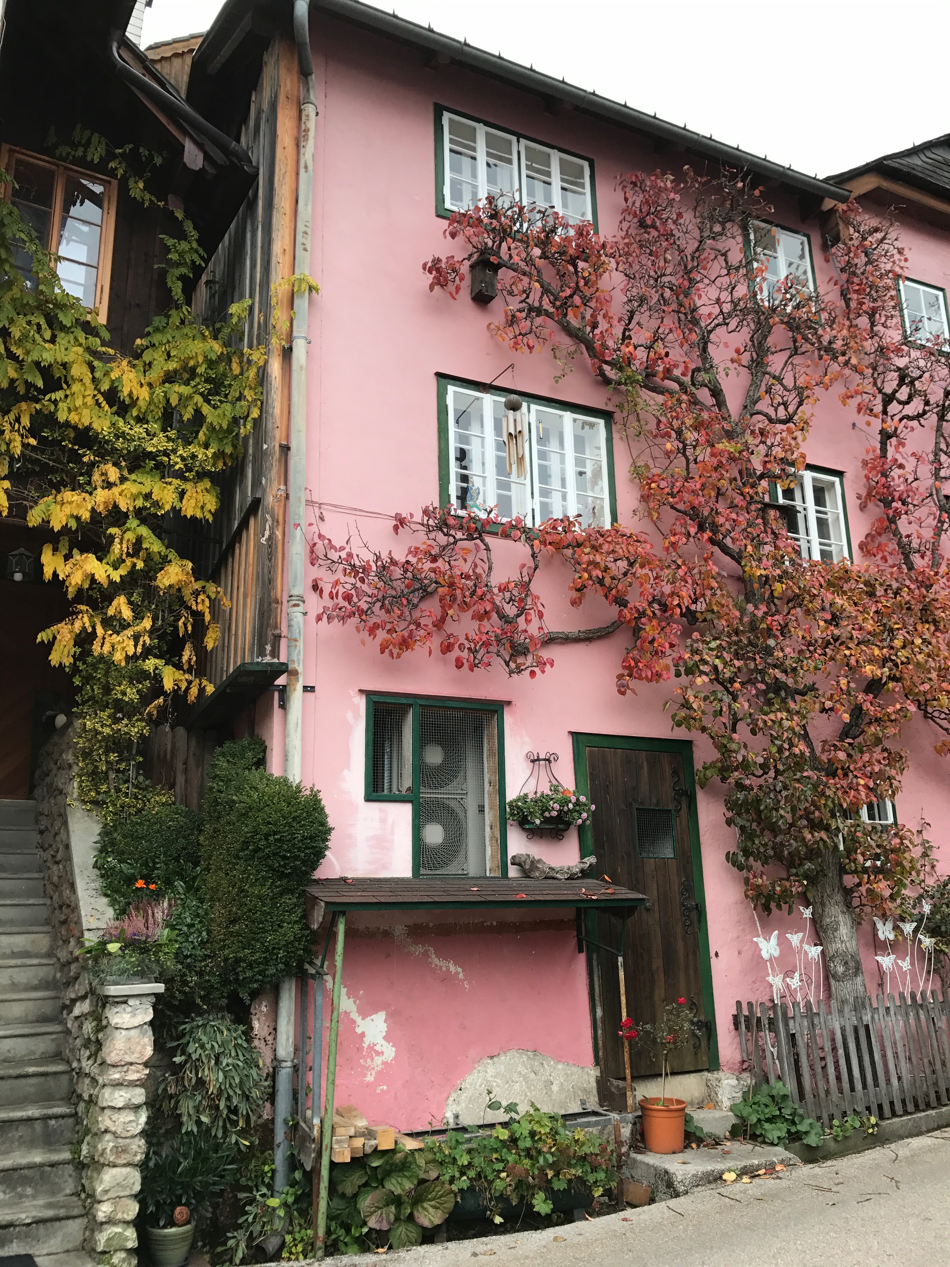 Anyway, Hallstatt: gorgeous, but a real odyssey to get to. We took a standing-room only bus from Salzburg to a station high in the Alps. Although we were basically leaning against the driver the whole ride there, the ascent was jaw-dropping. The mountains soared all around us, opening to deep blue lakes so calm they reflected the mountains like glass. The leaves were all red and orange and gold; the mountains craggy and huge and scattered with sheer chalk-white cliffs that dropped into the water. I remember being so awed by the mountains, which seemed to me like slumbering giants– so powerful and peaceful at the same time.