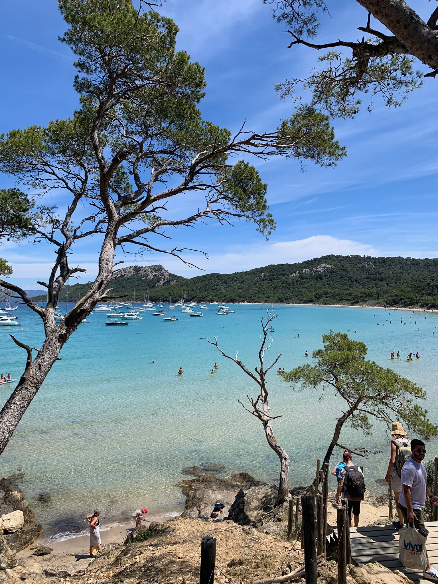 We descended a wooden staircase and picked our way along the narrow beach until we found a spot big enough for all of us. It seemed a bit crowded to me, as I’m used to more spacious beaches. But apparently it wasn’t crowded compared to high season levels. In June there are only two boats that take people from the mainland to Porquerolles. In July and August, there are eight. Unimaginable!